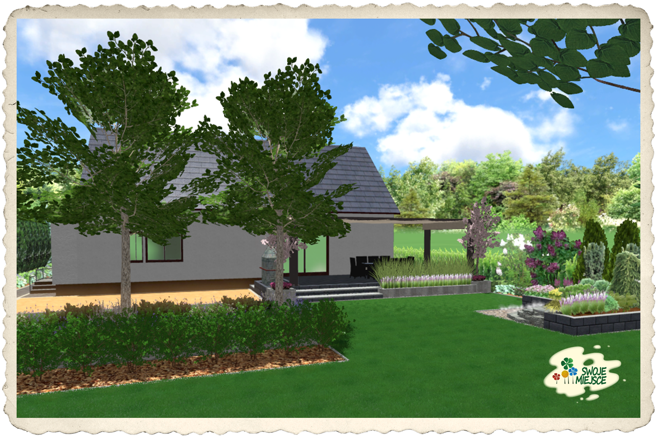 „W pierwszej koncepcji wykorzystałam wszystkie elementy, które już zostały zaprojektowane i wykonane. Jest to wersja ekonomiczna. Pozostają prawie wszystkie Thuje oraz wszystkie ścieżki i podjazdy. Powiększyłam podjazd jako dodatkowe miejsce parkingowe i w lewym narożniku śmietnik wydzielony drewnianymi panelami oraz otoczony pergolą z pnączami. Oczywiście zamiast paneli można wymurować ścianki, ale to już wersja droższa. Ścieżki komunikacyjne od strony północnej i południowej zaprojektowano z tej samej kostki co istniejąca. Mały taras od strony południowej jest szerokości 2 m i przylega do niego ścieżka prowadząca na ogród właściwy. Taras zaprojektowano w kształcie litery L. Na tarasie głównym zaprojektowano z boku grill z wędzarnią oraz dużą ocieniającą pergolę. Trawnik został asymetrycznie podzielony na 2 części. Przy tarasie i placu zabaw jest trawnik reprezentacyjny, natomiast za rabatą z brzozami jest trawnik sportowy do gier i zabaw. Właściwy plac zabaw o wielkości 4 x 4 m przylega do rabaty z brzozami, ale z możliwością powiększenia w zależności od Państwa preferencji. W przyszłości może służyć jako plac pod basen lub jakuzzi. Blisko tarasu zaprojektowałam także mały element wodny w otoczeniu podniesionej rabaty krzewiasto-bylinowej. Element ten to 3 grube, nieregulane płyty kamienne o różnej wielkości w formie kaskady. Do tarasu przylega rabata z krzewami owocowymi. W zależności od ilości gatunków i odmian, które będą sobie państwo życzyli może ulec powiększeniu kosztem trawnika. Od strony północnej, przy schodach i wejściu gospodarczym zaprojektowałam drewutnię. Warzywnik zgodnie z życzeniem od strony tarasu. Jeśli chodzi o szatę roślinną to w tej koncepcji jest bardzo różnorodna, wiele gatunków i odmian. Nowoczesna, ale raczej w stylu obecnych tendencji angielskich – „dzikość ujarzmiona””