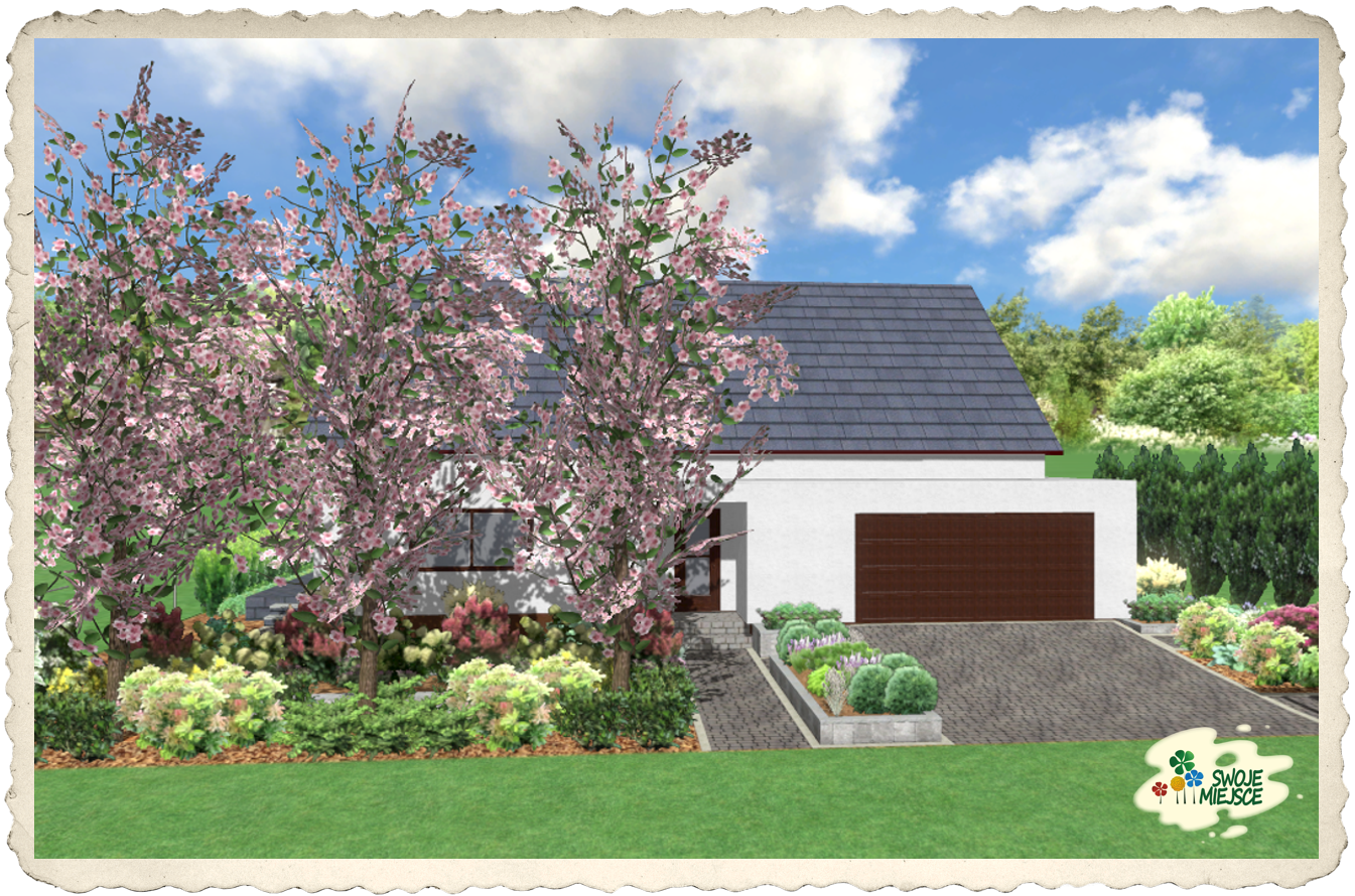Właściwy przedogródek obsadzono kolorową, mieszaną kompozycją z roślin cienioznośnych z centralnie posadzonymi trzema wiśniami o architektonicznej strukturze. W narożniku północno-wschodnim odwrócono uwagę od śmietnika dzięki posadzeniu solitera – czerwonej wiśni ozdobnej. Wzdłuż granicy południowej od początku tarasu do jego końca zaproponowano żywopłot nieformowany z cisa podsadzony trawami. Ponieważ odległość od tarasu do ogrodzenia to tylko 1,5 m będzie on stanowił całoroczną zasłonę i zapewni intymność. Od tej strony zgodnie z życzeniem inwestora, przed wejściem na południowy taras zaprojektowano malutki warzywnik. Od strony północnej na całości zaproponowano szpaler z kolumnowych drzew oraz rabatę żwirową wzdłuż domu. Tutaj też umieszczono drewutnię.