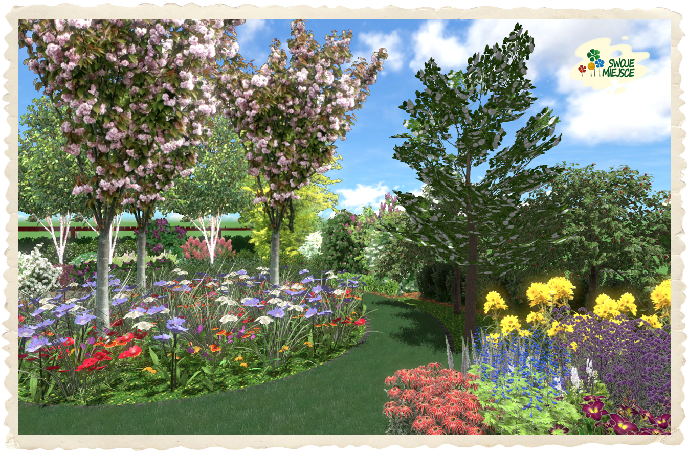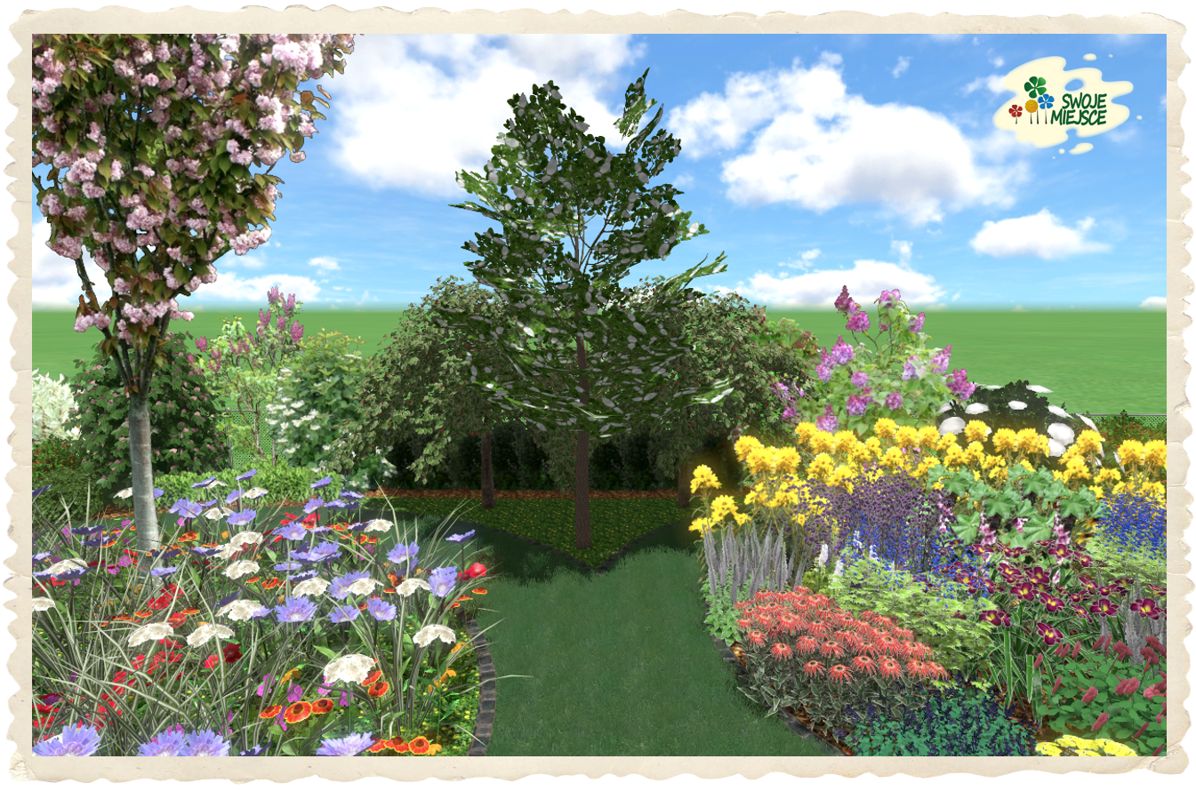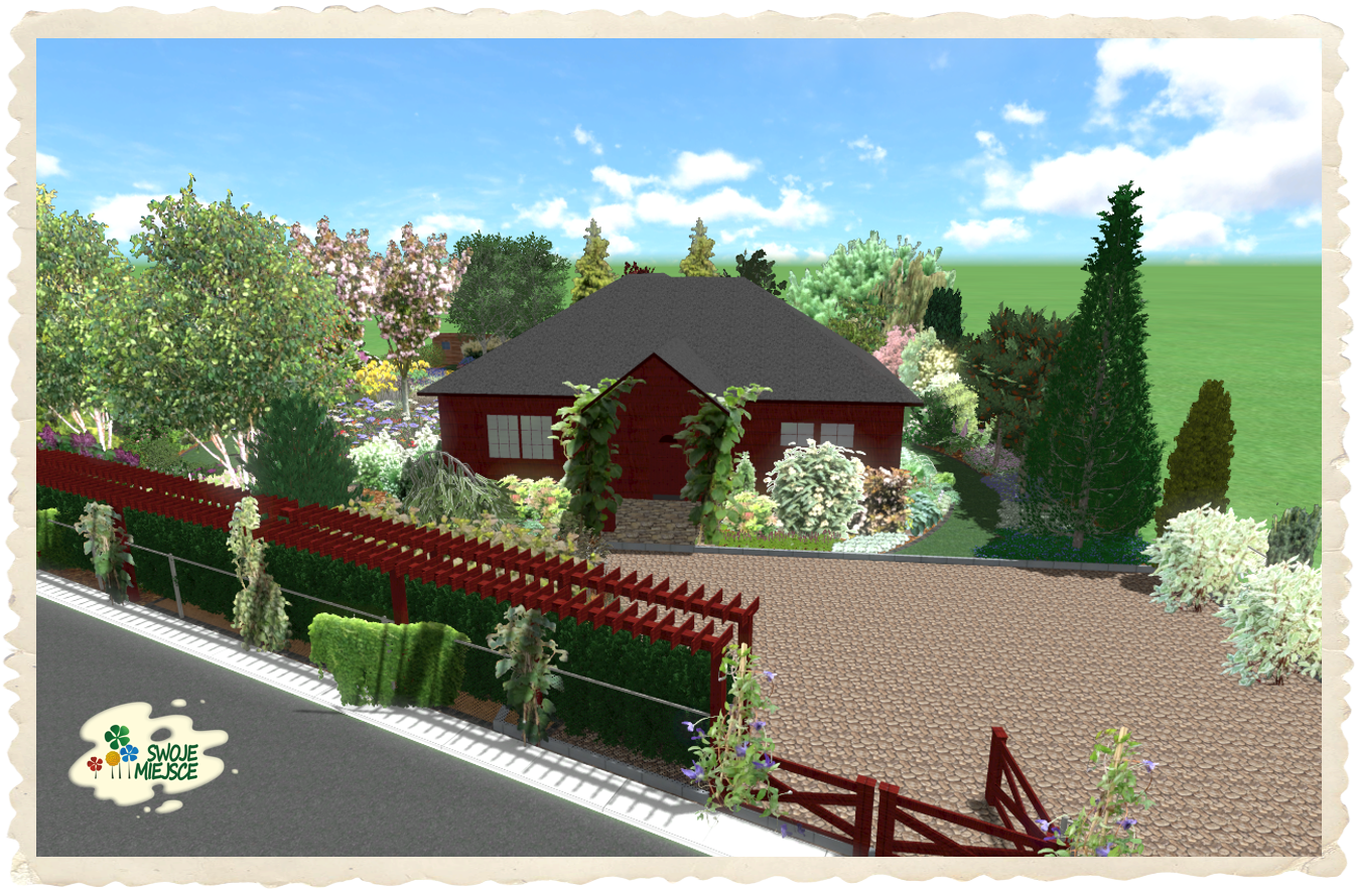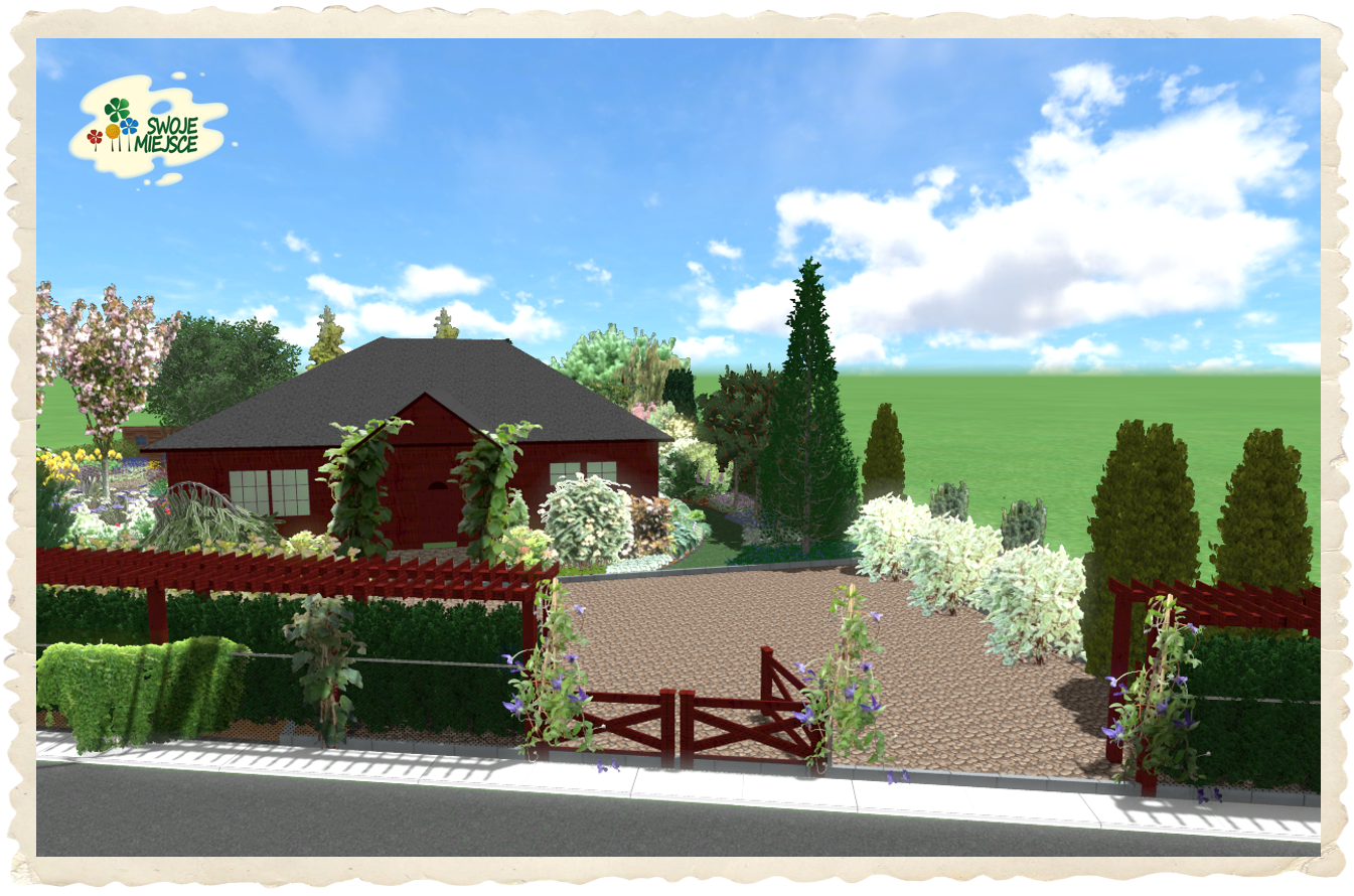 Podstawową cechą projektowanego terenu jest jego posadowienie w typowo wiejskim krajobrazie i dlatego dzikie kwiaty stały się „myślą przewodnią” dla tworzonej koncepcji. Kształt ścieżek będących jednocześnie trawnikiem „naśladuje” płatki kwiatów polnych. Przed domem zaprojektowano ogrodzenie z istniejącej siatki metalowej z dwoma trejażami biegnącymi wzdłuż ogrodzenia obsadzonymi pnączami: hortensją pnącą, winobluszczem, winoroślą japońską i powojnikiem (pnącza do cienia). Pomiędzy trejażami zaproponowano wypełnienie z wysokiego żywopłotu liściastego.