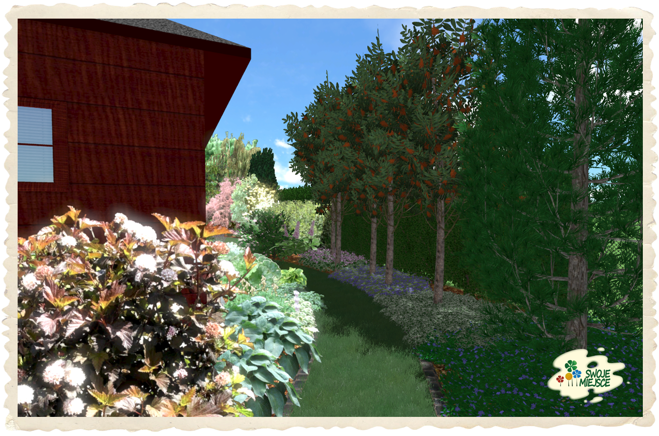 Właściwy przedogródek obsadzono kolorową, mieszaną kompozycją z roślin cienioznośnych. Ogród właściwy podzielono ścieżkami z trawnika na kilka obszarów. Od strony południowej, blisko ogrodzenia posadzono wysokie drzewa, aby uzyskać jak najwięcej ocienionych miejsc. Pod drzewami, na wprost tarasu zaproponowano kącik wypoczynkowy z ławeczką oraz pergolą jako podporą dla pnączy. Wokoło tarasu zaproponowano dwie duże rabaty krzewiasto-bylinowe o odmiennej kolorystyce. Natomiast centralnie przed tarasem umieszczono wrzosowisko.