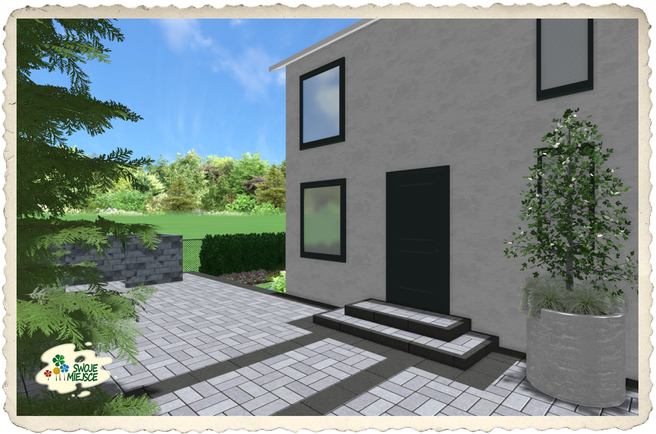 Właściwy przedogródek został już wykonany. Całość stanowi nawierzchnia z kostki betonowej tylko wzdłuż ogrodzenia pozostawiono starodrzewie iglaste w formie nieformowanego żywopłotu. W projekcie zaproponowano tylko podsadzenie szpaleru bylinami cienioznośnymi i zaprojektowano miejsce na śmietnik.
