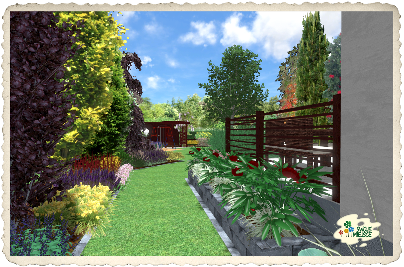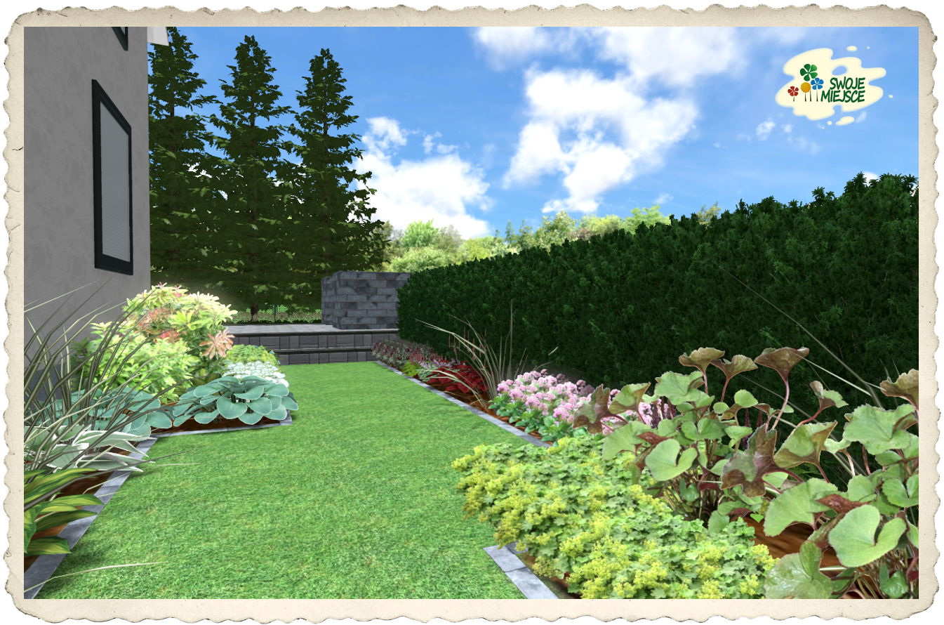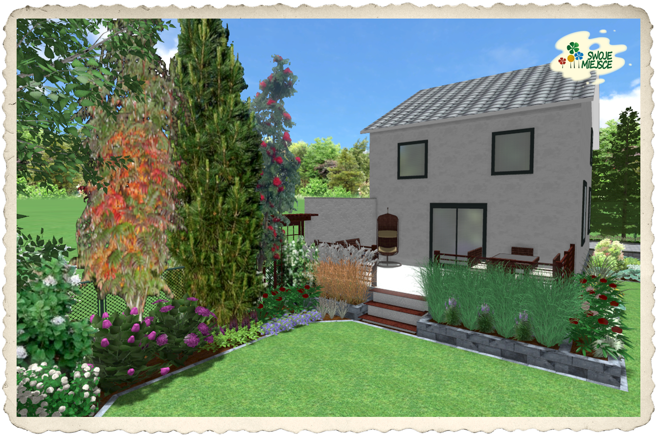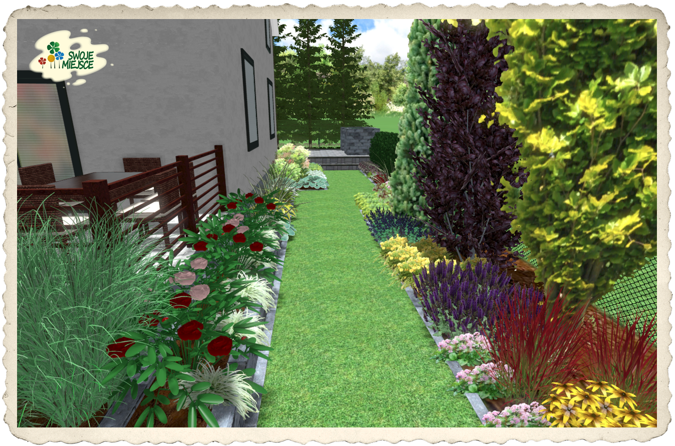 Linie trawnika i rabat poprowadzono pod kątem 45 stopni dla optycznego powiększenia wąskiego ogrodu. Przy wysokim na 70 cm tarasie zaproponowano podwyższone rabaty bylinowe wokół tarasu aby zniwelować tą różnicę, połączyć taras z ogrodem i obudować schody tarasowe. Centralnym punktem ogrodu właściwego stała się samosiejka brzozy w okolicy tarasu. Jako soliter wyznacza linię trawnika i automatycznie dzieli ogród na 2 części. Część reprezentacyjna przy tarasie oraz część dalszą, częściowo ukrytą rekreacyjno-użytkową.