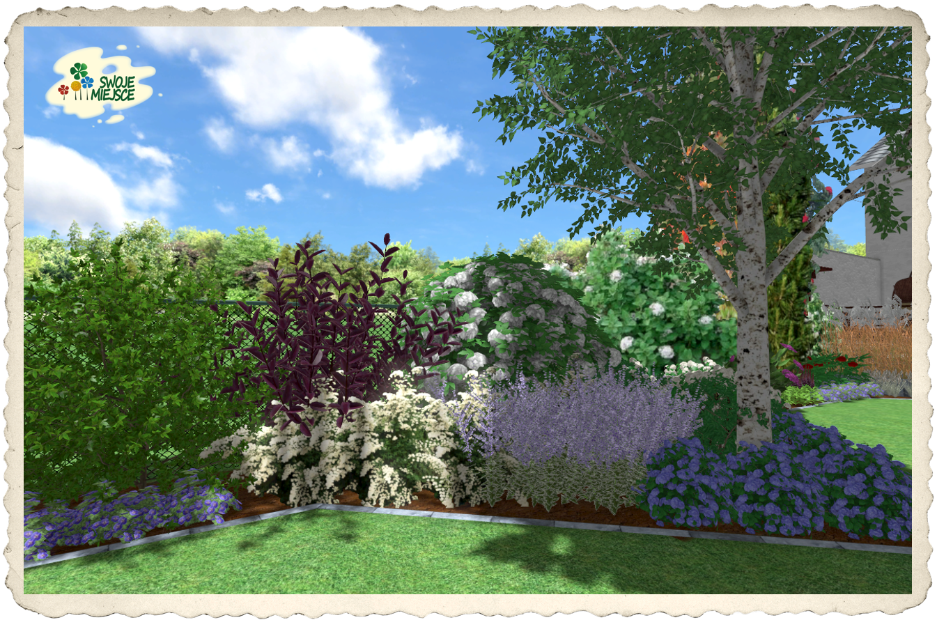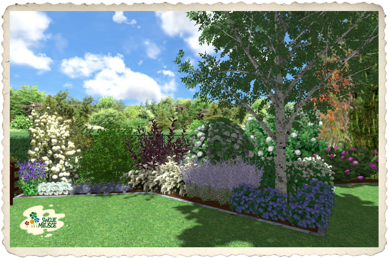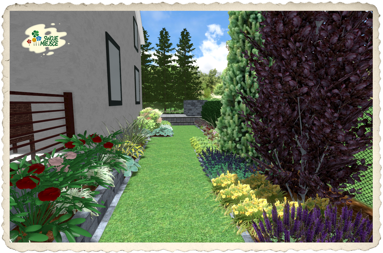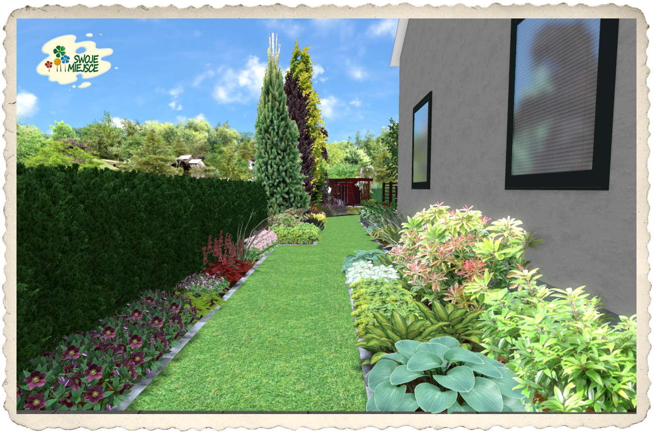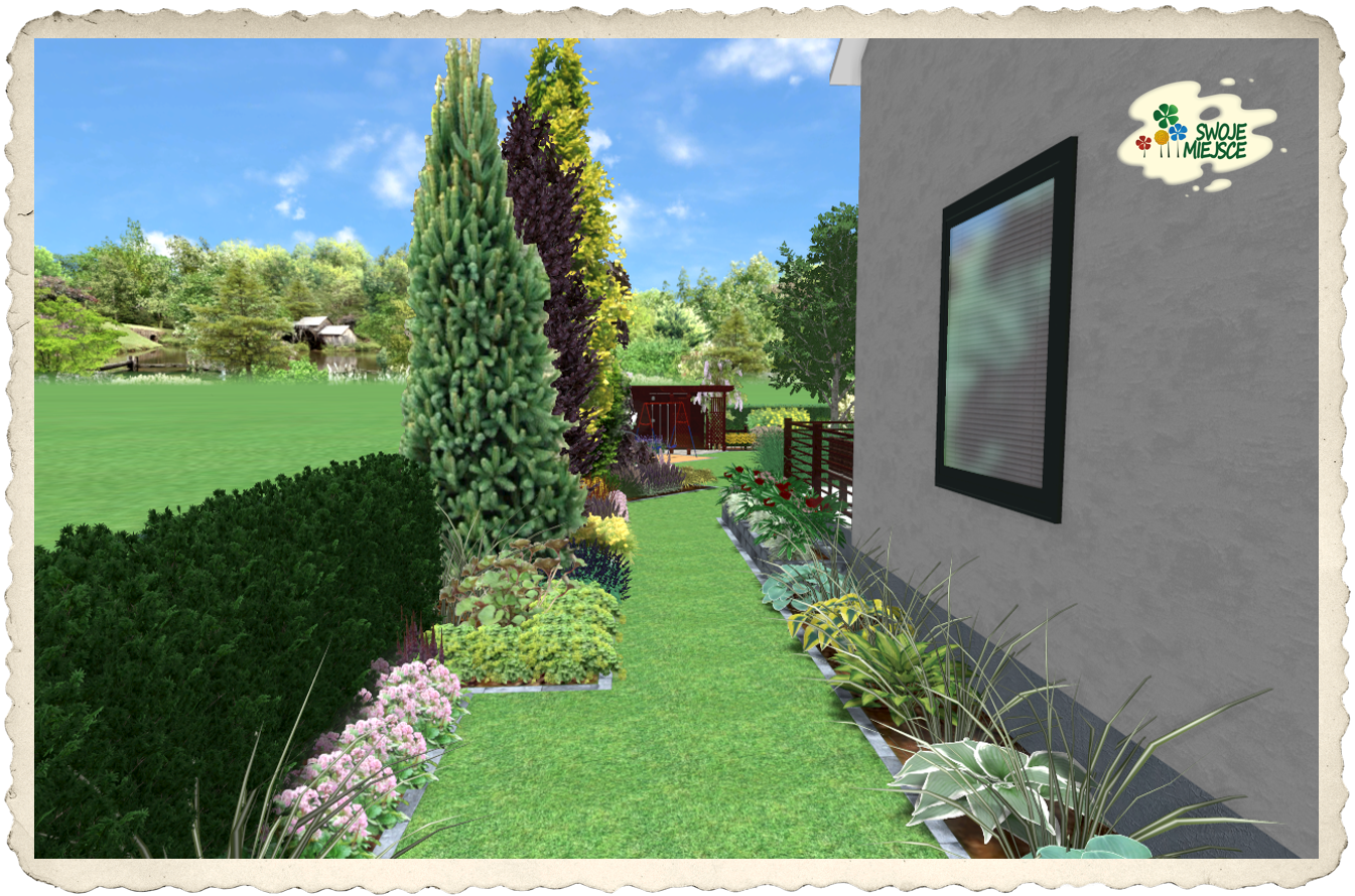 Linie trawnika i rabat poprowadzono pod kątem 45 stopni dla optycznego powiększenia wąskiego ogrodu. Przy wysokim na 70 cm tarasie zaproponowano podwyższone rabaty bylinowe wokół tarasu aby zniwelować tą różnicę, połączyć taras z ogrodem i obudować schody tarasowe. Centralnym punktem ogrodu właściwego stała się samosiejka brzozy w okolicy tarasu. Jako soliter wyznacza linię trawnika i automatycznie dzieli ogród na 2 części. Część reprezentacyjna przy tarasie oraz część dalszą, częściowo ukrytą rekreacyjno-użytkową.