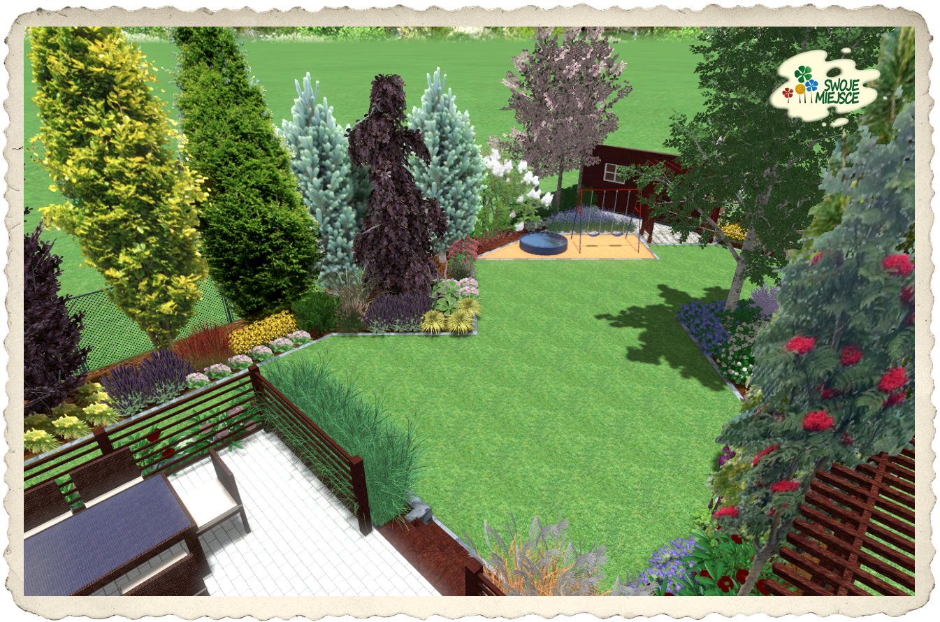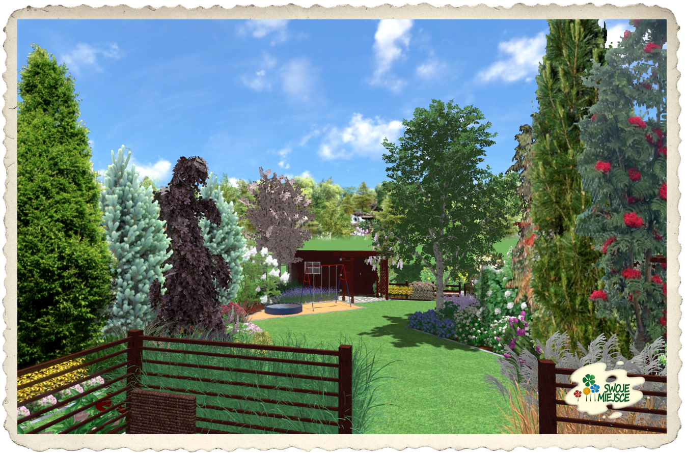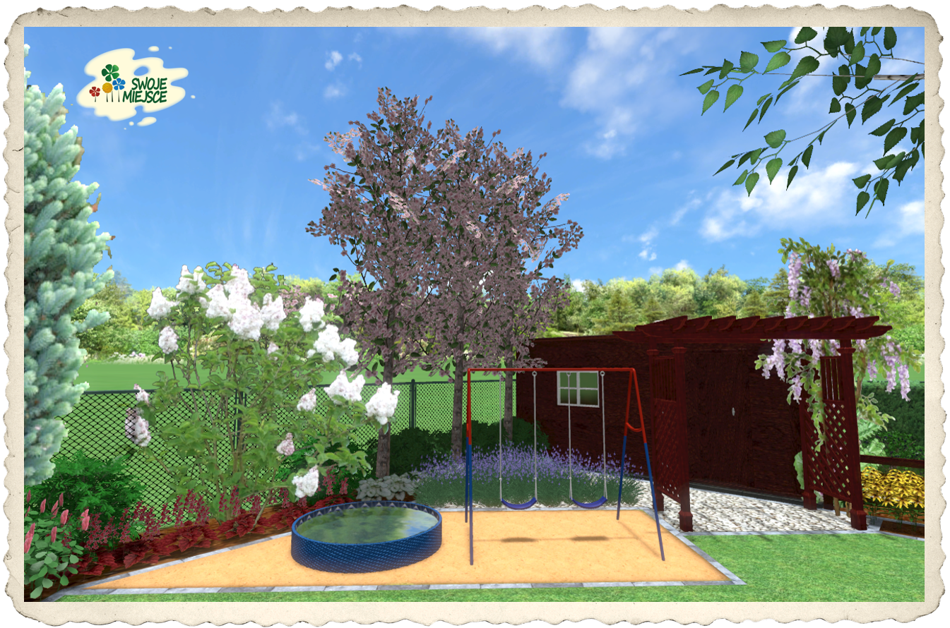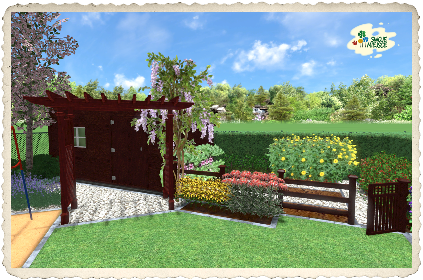 W drugiej części ogrodu zaprojektowano duży domek narzędziowy (3×5 m) ukryty za brzozą od strony południowej. Za domkiem w narożniku ogrodu zaproponowano żółto listne drzewo oraz miejsce żwirowe na kompostownik i zbiornik na deszczówkę. Centralnie na końcu ogrodu zaprojektowano plac zabaw dla dzieci widoczny z tarasu dla bezpieczeństwa. Zaprojektowano go w większym wymiarze niż prośba inwestora, przewidując jego późniejsze wykorzystanie np. pod basen, miejsce ogniskowe czy hamak.