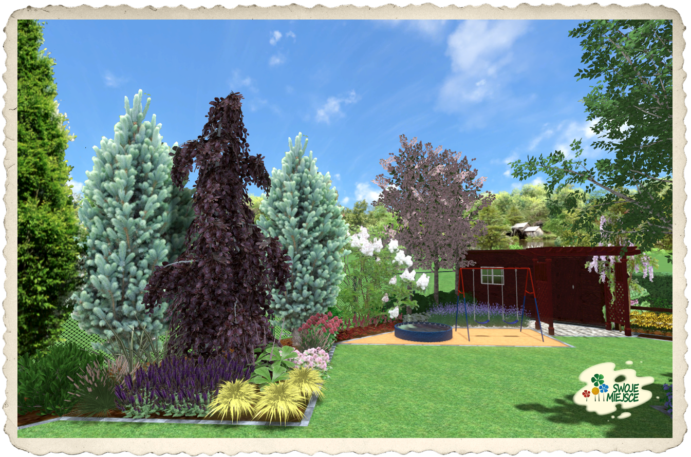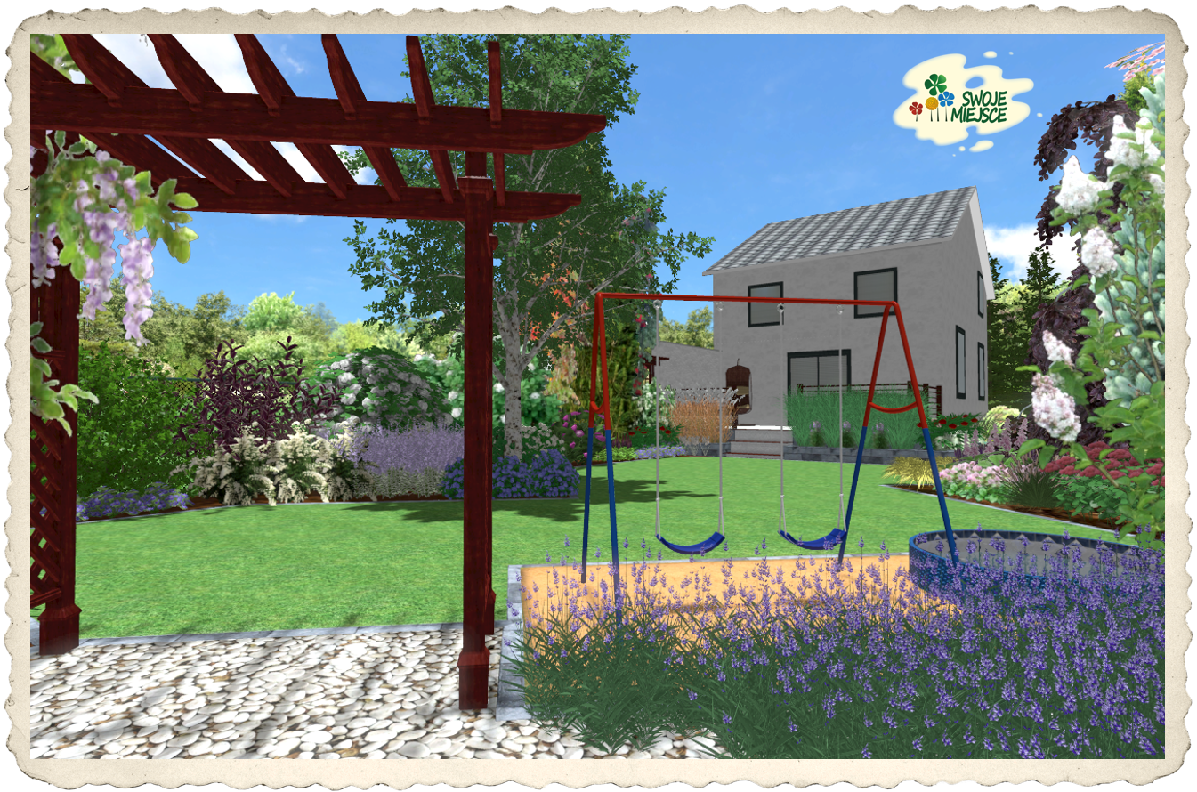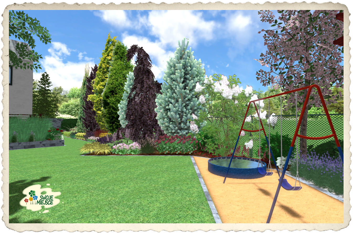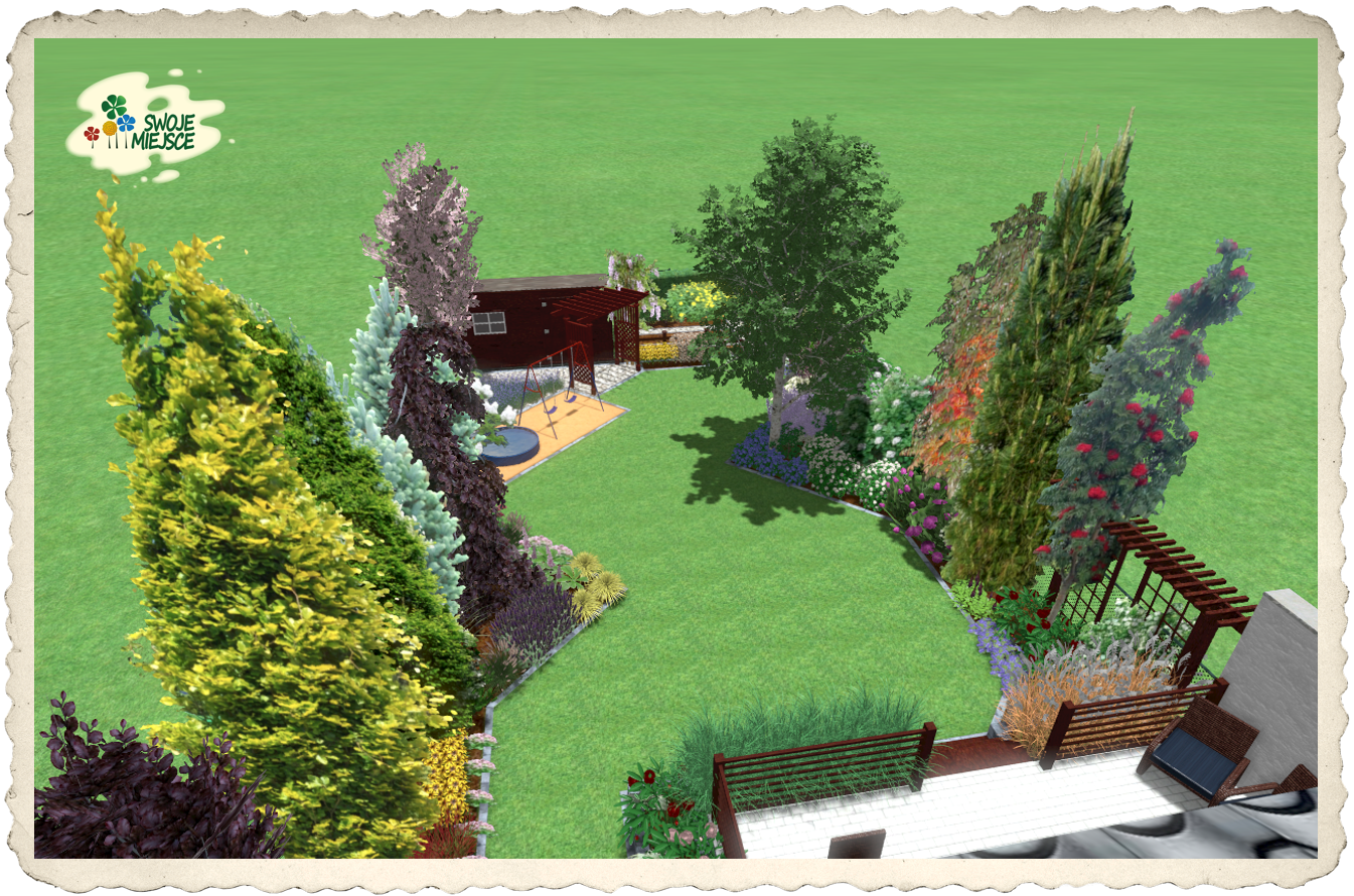 W drugiej części ogrodu zaprojektowano duży domek narzędziowy (3×5 m) ukryty za brzozą od strony południowej. Za domkiem w narożniku ogrodu zaproponowano żółto listne drzewo oraz miejsce żwirowe na kompostownik i zbiornik na deszczówkę. Centralnie na końcu ogrodu zaprojektowano plac zabaw dla dzieci widoczny z tarasu dla bezpieczeństwa. Zaprojektowano go w większym wymiarze niż prośba inwestora, przewidując jego późniejsze wykorzystanie np. pod basen, miejsce ogniskowe czy hamak.