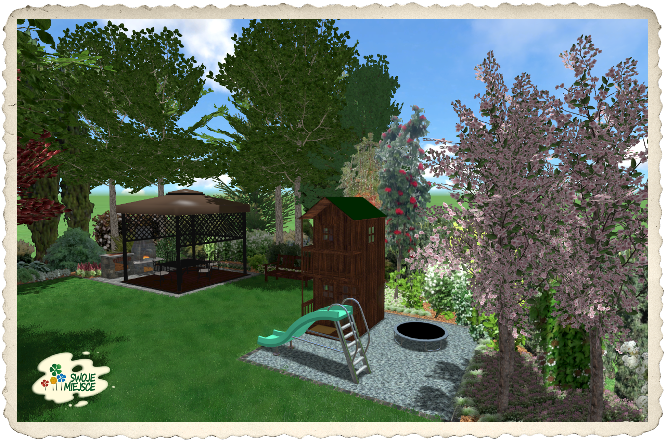 Zaprojektowanie w bliskim sąsiedztwie tarasu niewielkiego placu zabaw dla dzieci, z piaskownicą, domkiem czy zjeżdżalnią;