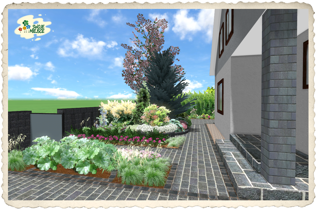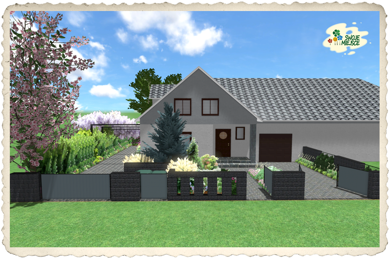 Przed domem zaprojektowano ogrodzenie z ozdobnych bloczków betonowych Semmelrock z elementami metalowymi pełnymi. Z uwagi na bardzo krótką linię zabudowy zaproponowano ogrodzenie z  „oknami” sprawiającymi wrażenie zwiększenia przestrzeni i lekkości. Właściwy przedogródek obsadzono kolorową, mieszaną kompozycją z roślin cienioznośnych z  centralnie posadzonym „błękitnym” świerkiem i  wieloma trawami. W narożniku północno-wschodnim odwrócono uwagę od śmietnika dzięki posadzeniu solitera – wiśni ozdobnej. Wzdłuż granicy wschodniej aż do początku tarasu zaproponowano żywopłot nieformowany z cisa podsadzony różnorodnymi roślinami okrywowymi. Od strony wschodniej na całości zlokalizowano podjazd dla samochodów, urozmaicony niewielkimi rabatami bylinowymi, oraz 3 trejaże  metalowe dla ulubionych roślin pnących.
